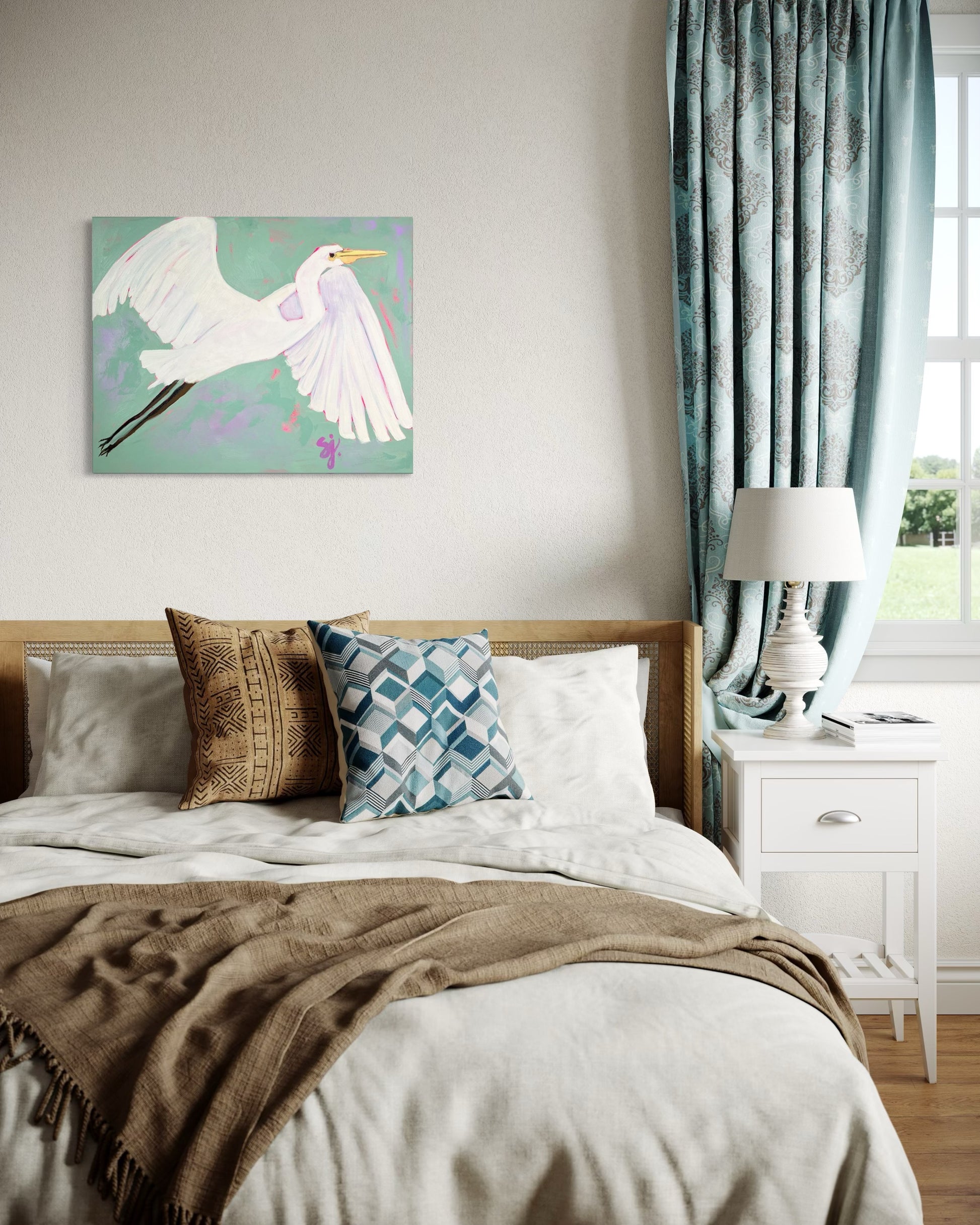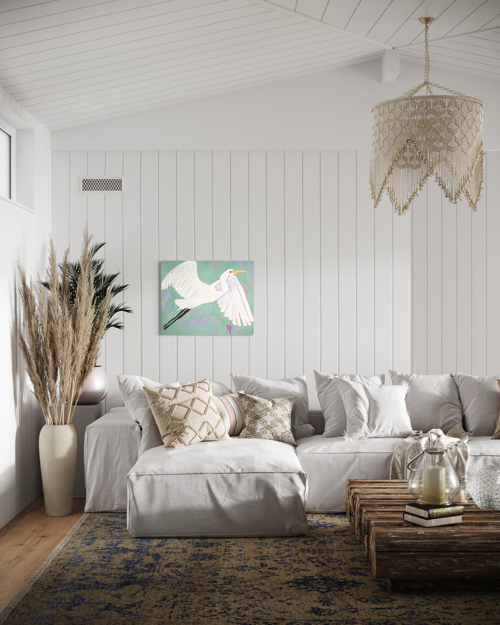 Elevate your coastal transitional decor with this medium size piece, a captivating contemporary painting that brings the essence of the shore into your home. Featuring a graceful silhouette of an egret gliding through a dreamy sky this piece creates a harmonious focal point for any room.