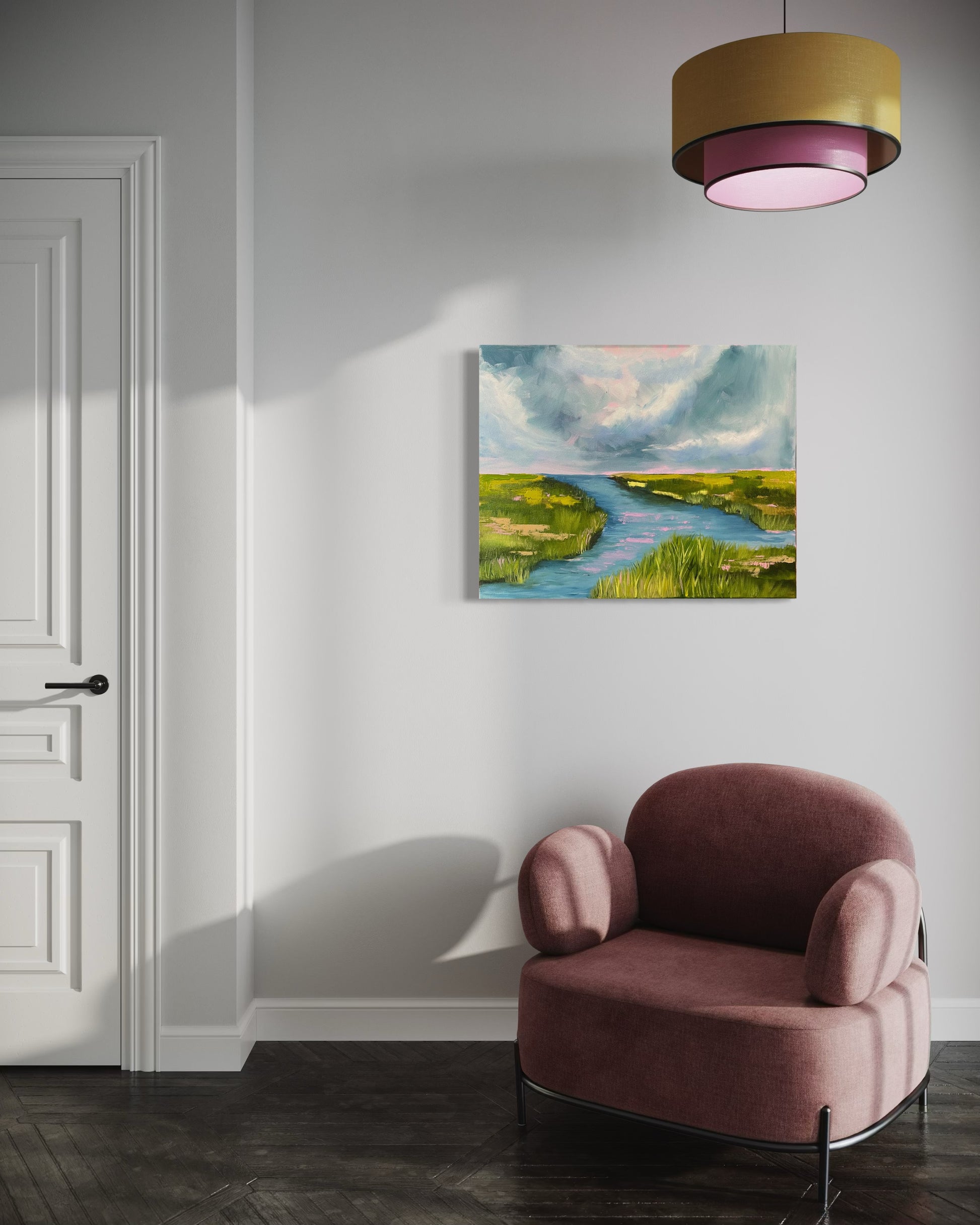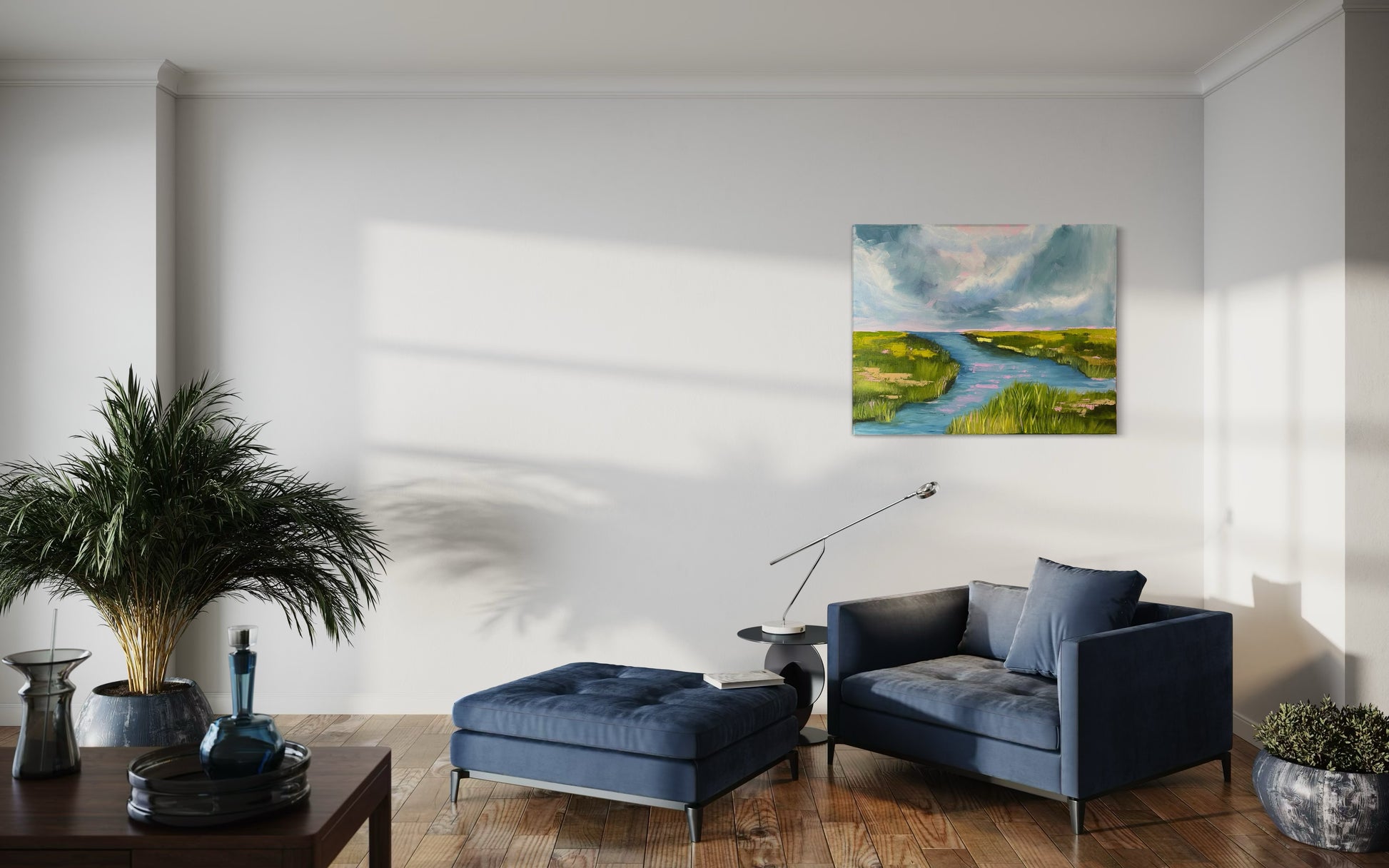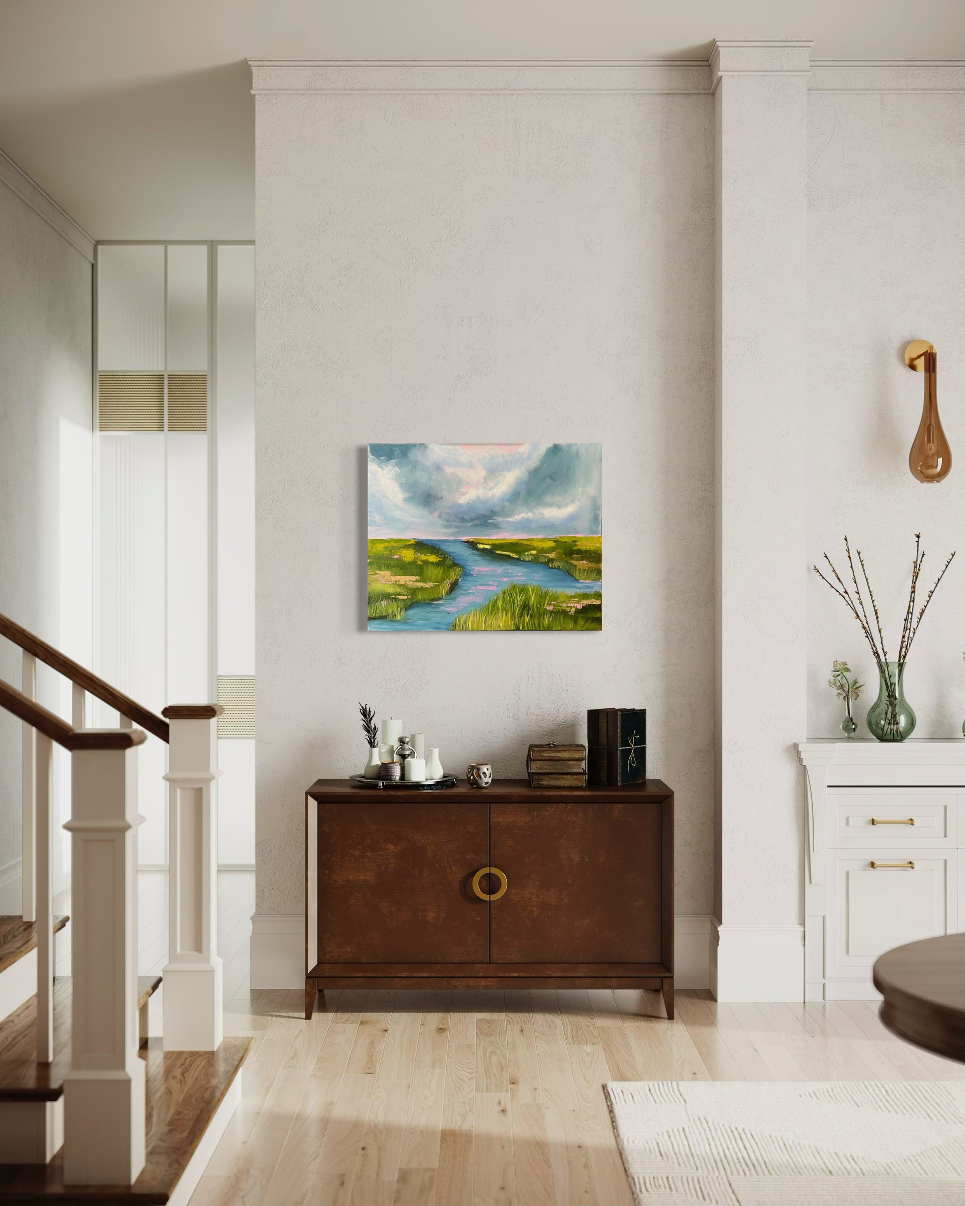 Standing at the marsh you feel a profound connection to mother nature, as if she's whispering secretes only you can hear. The gentle rustle of reeds, the distant call of birds, and the shimmering reflections on the water evoke a sense of calm and introspection. This painting encapsulates that moment, allowing you to carry a piece of that serenity into your everyday life.